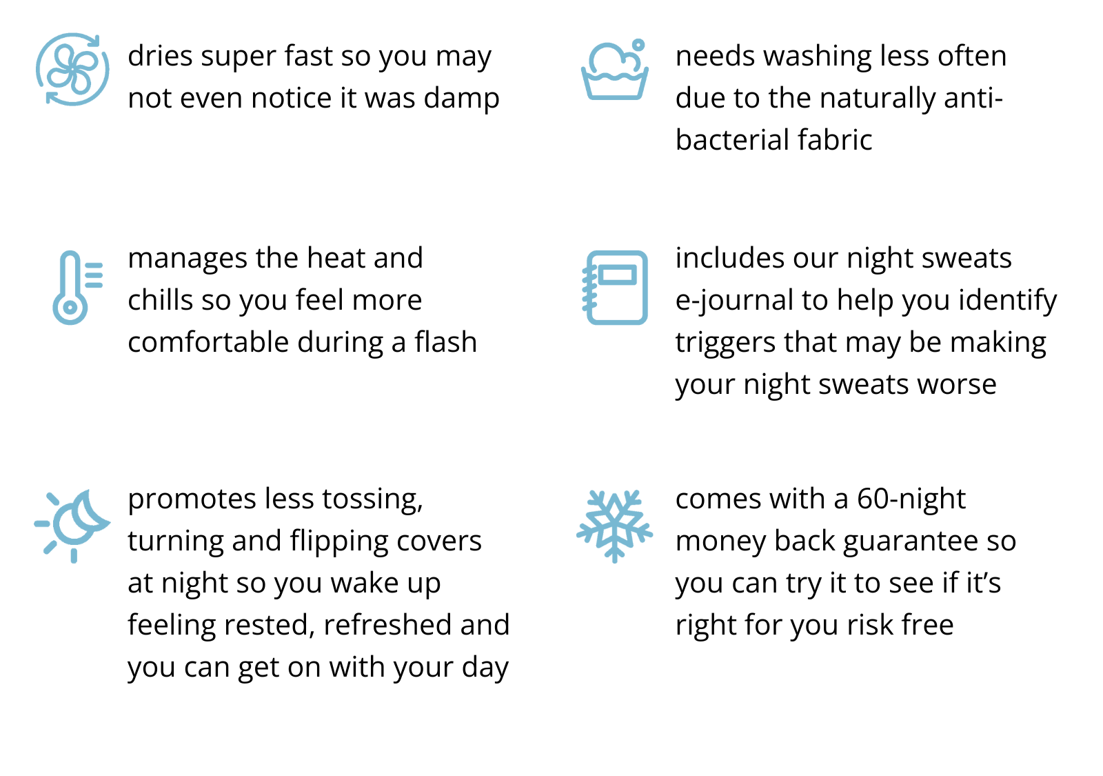 "I love this, even more than I thought I would, the style is lovely, beautiful soft fabric and it really makes a huge difference with night sweats." – Sally